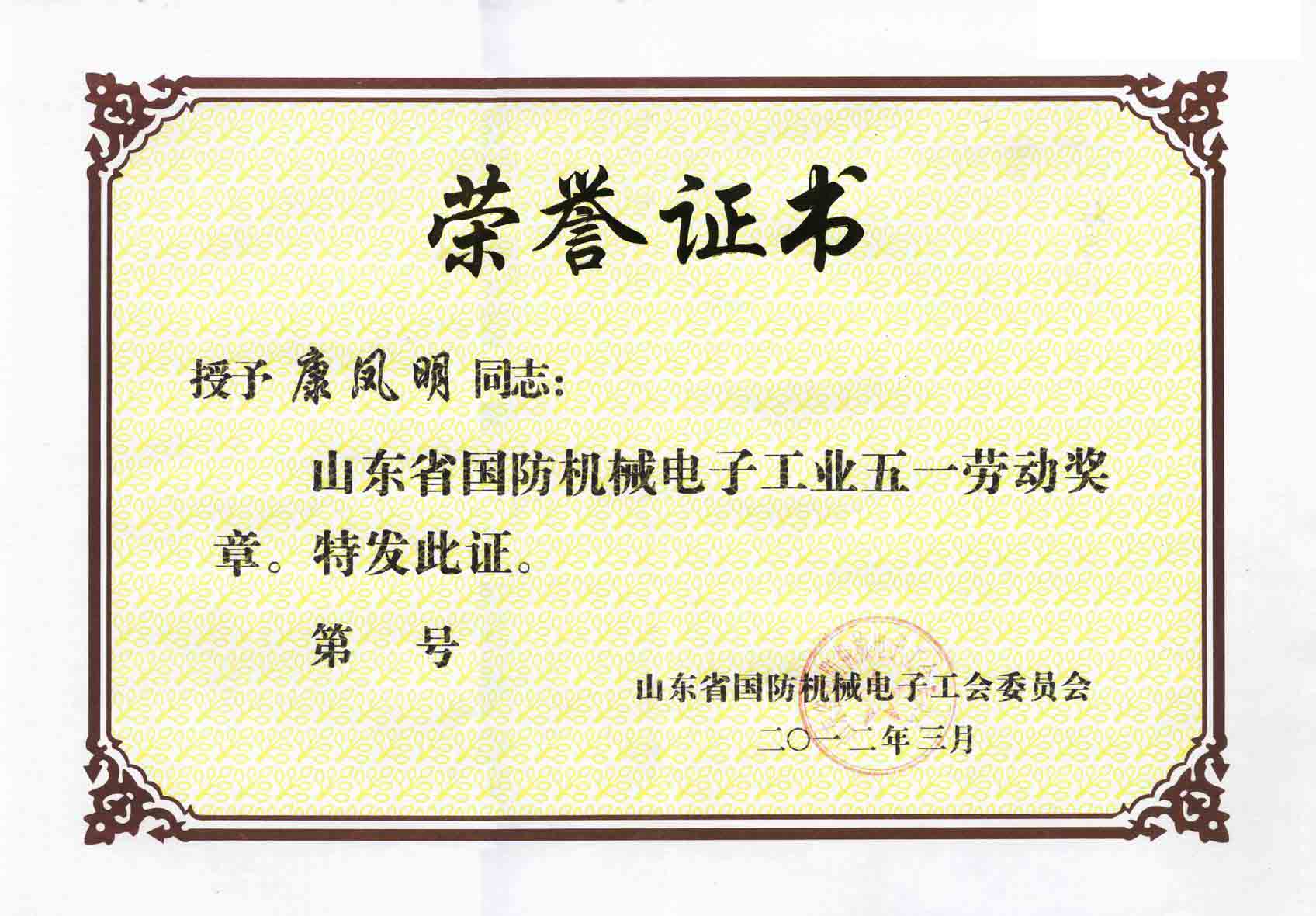3月29日,山东省国防机械电子工会二届二次全委会暨女职委一届四次会议在济南胜利召开。会议隆重表彰了山东省国防机械电子工业“五一”劳动奖状(章)先进集体和个人,授予38个单位(班组)劳动奖状,61名同志劳动奖章。集团董事长、总经理康凤明荣获“五一”劳动奖章。