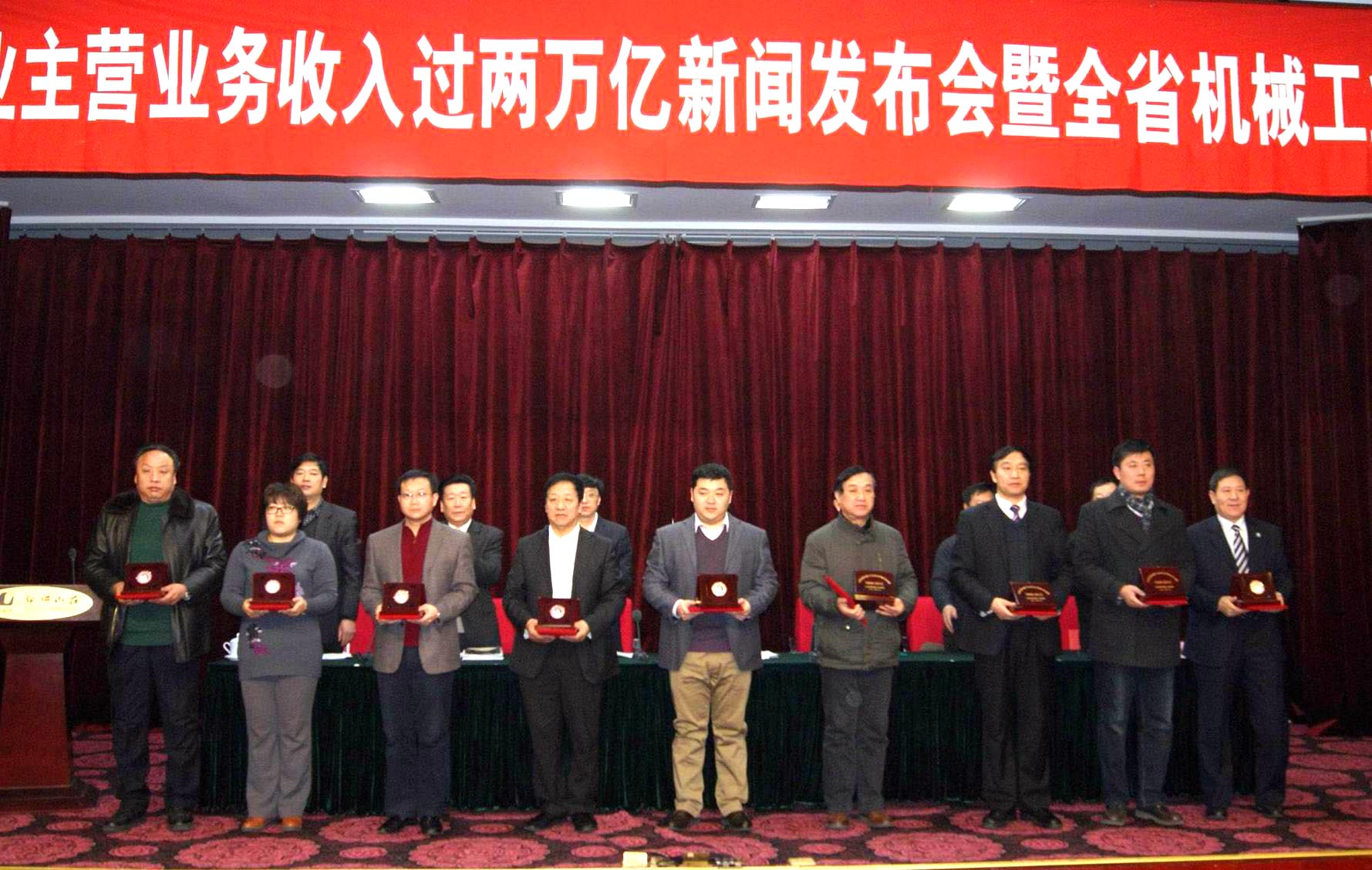 全省机械工业主营业务收入超过两万亿元新闻发布会暨全省机械工业工作会议1月19日在济南舜耕山庄召开,省政协副主席李德强、中机联执行副会长杨学桐、省经信委副主任杨少军、省总工会副主席王星海等领导应邀出席。集团董事长康凤明被授予山东省机械工业杰出贡献企业家荣誉称号,并获银质奖章。受董事长委托,康峰副总经理代表宏康集团参加会议并上台领奖。