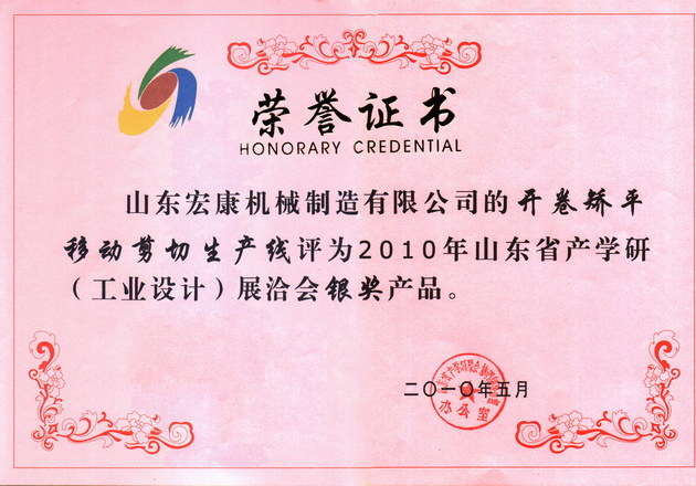“这是宏康公司自主研发生产、拥有多项自主知识产权的开卷矫平移动剪切生产线,该生产线通过上料、开卷、矫平、移动剪切、码垛、出料、打包加工等过程,加工成用户需要的材料规格......”5月25日,济南舜耕国际会展中心泰安展区,公司董事长、总经理康凤明向前来巡视指导恰展会的省委常委、副省长王军民、国家工信部科技司副司长沙南生、省经信委主任郭述禹、泰安市副市长闫新建、市经信委主任王光锋等领导介绍着公司参展的山东省重点领域首台套技术装备产品----移动剪生产线的模型。当日,为期两天的2010年山东省产学研(工业设计)展览洽谈会在济南舜耕国际会展中心开幕。公司参展的按照实物1:20缩小而成的12×2000开卷矫平移动剪切生产线模型,以逼真、流畅、美观大方的设计展现了在公司技术创新、工业设计中的雄厚实力,吸引了广大参观客商和参展代表前来参观洽谈和交流,并与多家企业达成了订购意向。在期间举办的工业设计论坛会,该生产线喜获银奖。